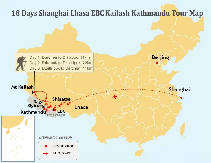 Tour Route: Lhasa - Gyantse - Shigatse - E.B.C - Saga - Kailash Trek - Darchen - Lake Manasarovar - Saga - Gyirong - Tingri - Lhasa