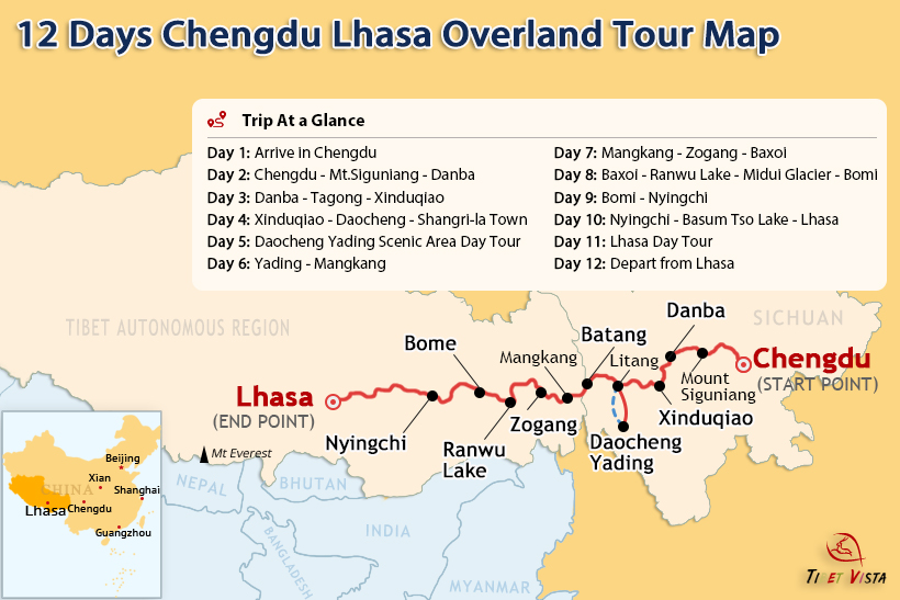 Chengdu - Kangding - Xinduqiao - Litang - Mangkang - Zogang - Ranwu - Nyingchi - Lhasa |