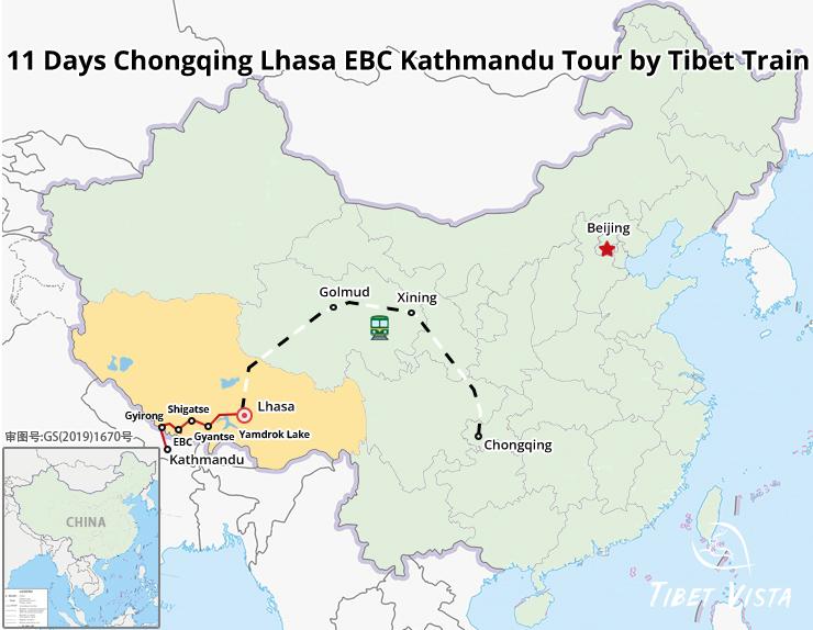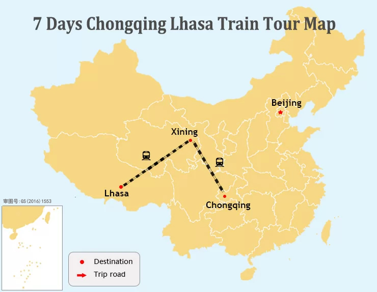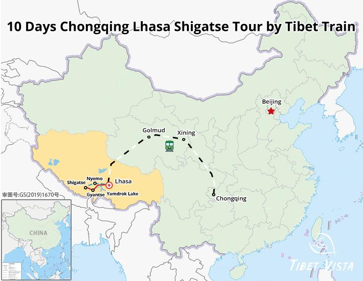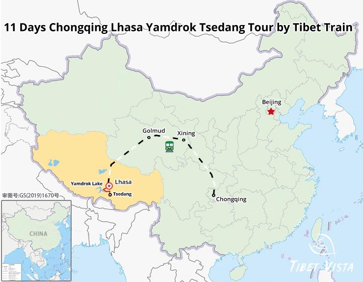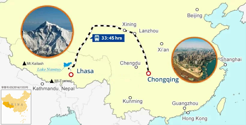 The Chongqing to Lhasa train takes you from the upper reaches of the Yangtse River Cruise, passes through the Chengdu Plain, crosses the Sichuan Basin, crosses the Qinling Mountains, passes by Xining, and finally reaches the Holy city Lhasa on the majestic Tibet Plateau.