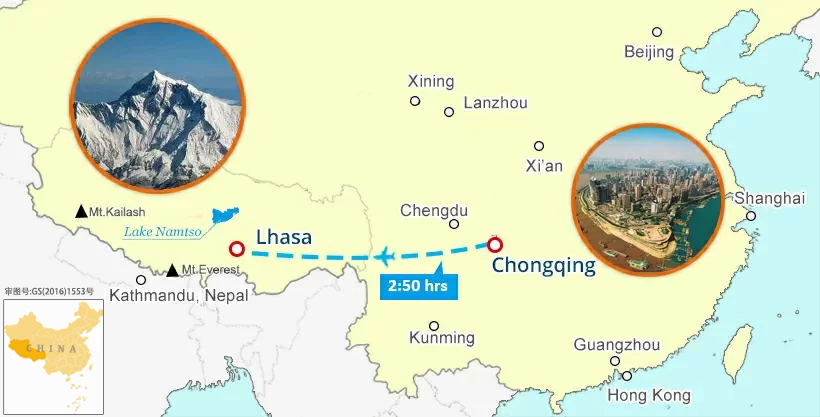There are frequent non-stop flights from Chongqing to Lhasa every day. The flight journey is less than 3 hours, which allows you to reach Tibet much faster. Besides, you can take a direct flight to Nyingchi, Tibet from Chongqing as well.