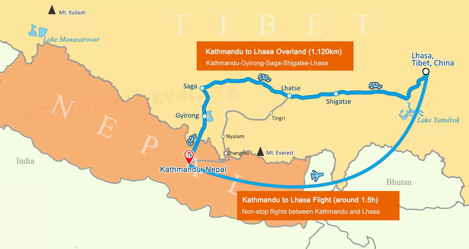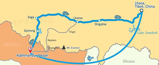 Travel Route: Kathmandu - Everest Base Camp - Shigatse - Gyantse - Lhasa