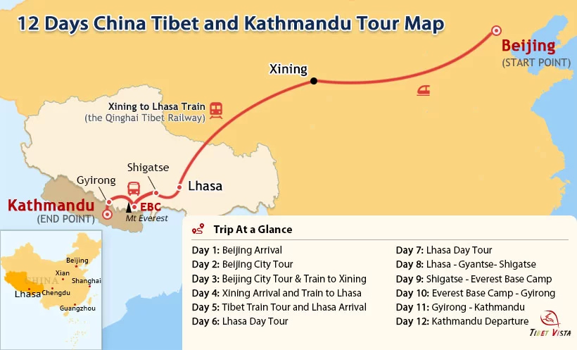Tour Route: Beijing - Xining - Qinghai Tibet Railway - Lhasa - Shigatse - Everest Base Camp - Gyirong - Kathmandu