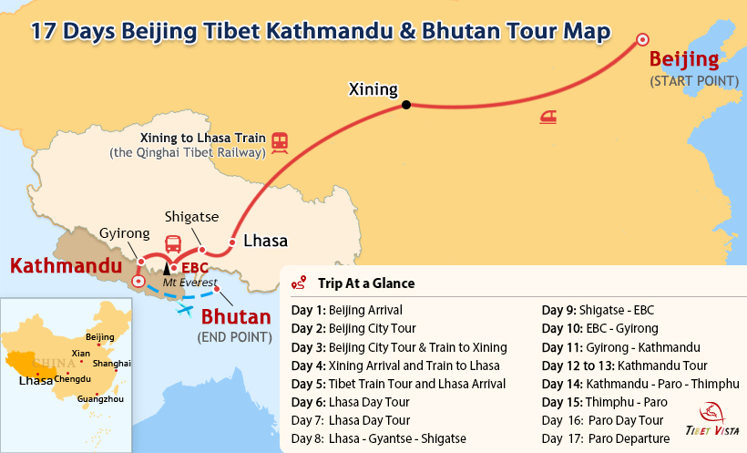 Tour Route: Beijing - Xining - Qinghai Tibet Railway - Lhasa - Shigatse - Everest Base Camp - Gyirong - Kathmandu - Paro - Thimphu - Paro