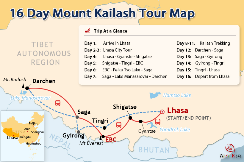 Tour Route: Lhasa - Gyantse - Shigatse - EBC - Saga - Darchen - Kailash Trek - Darchen - Saga - Gyirong - Tingri - Lhasa