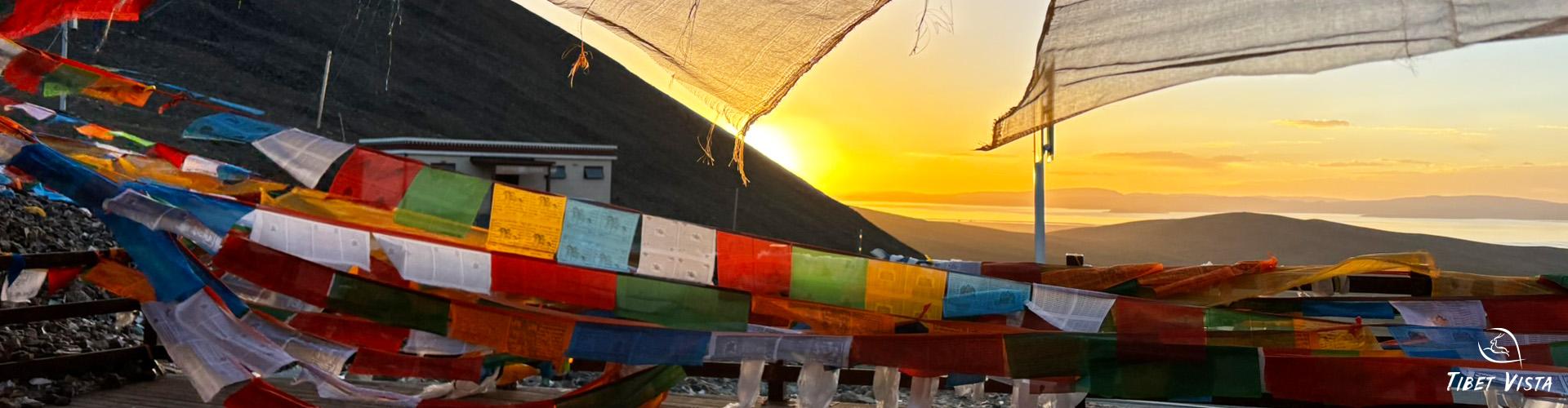 Warm sunset over Namtso Lake with prayer flags fluttering at Nagen La Pass.
