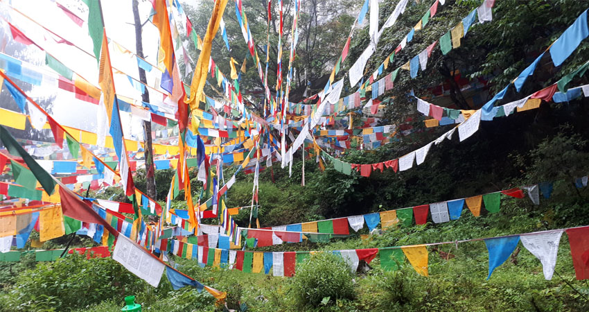 Padmasambava cave draped with colorful Tibetan prayer flags