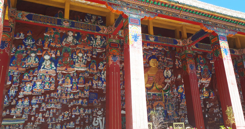 After dropping our bags at the hotel, we then went for a short walk through the forest surrounded by snowy mountains, to discover Kepu village and the Padmasambava cave hidden among many praying flags. Having a bit of free time, I decided to walk around the town streets with one of my travel partners to visit the small temple inside the city and was impressed by all the paintings decorating its walls.