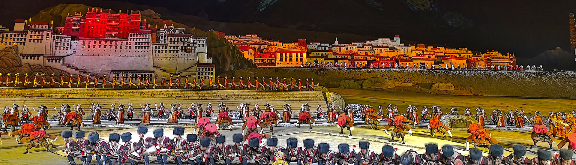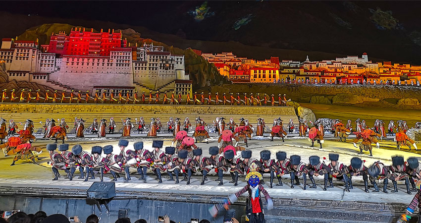 An optional program, not included in the trip schedule and price, is the “Princess Wencheng” opera show, that is truly worth watching and experiencing. It is an epic fairy tale of love between a teenage princess, Wencheng, and a noble emperor, King Songtsen Gampo, of the first bonds of friendship between China and Tibet that sprung up more than 15 centuries ago. It reflects the true story of the year 641, when Princess Wencheng married King Songtsen Gampo of the Tibetan Empire and their subsequent life. The show is set on an open-air stage, that is huge, made up of multiple levels, with the scenic mountain behind as the background. The show was performed by thousands of actors, with beautiful costumes, stage settings, and amazing lighting effects (see photo below).