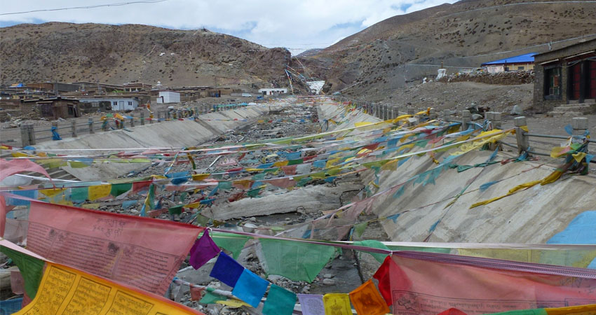 Darchen glacier runoff lined with prayer flags.