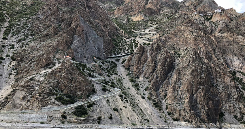 The scenery along the way was breathtaking: rugged mountains, high altitude passes, barren landscape, scarce vegetation, occasional goat and yak, and hardly a human soul. Workers were trying to install power line at altitude of 5000 meters. Forget about cell phone signals. There were none. The place was hostile to living souls.