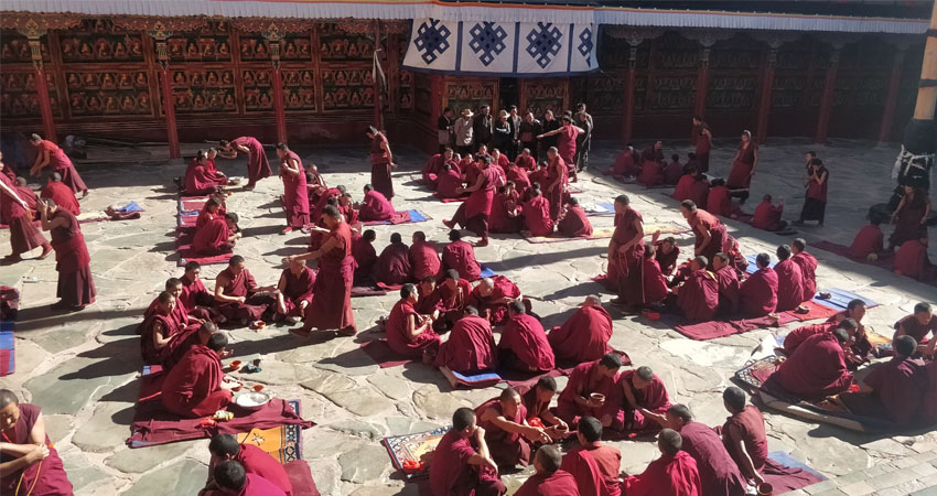 The monks take it in turns to expound the principles of Buddhism and are met with a barrage of criticism from their fellow students. It gives these trainees a good chance to defend the principles of Buddhism and demonstrates their knowledge of the big picture of Buddhist philosophy. The debating is a sort of test - can they explain and defend the philosophy of Buddhism?