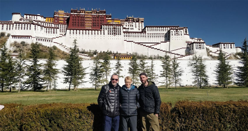 Getting the obligatory photo outside Potala Palace with my tourmates David and Jeanne